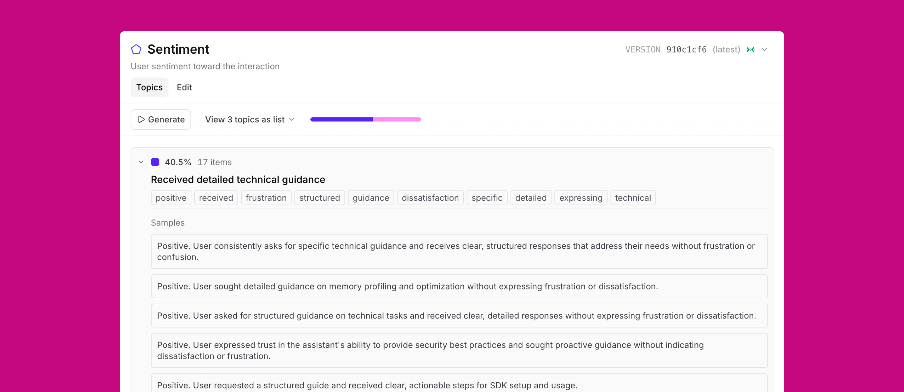 Topics, available in beta today, summarizes each trace into a simple statement, then clusters them into categories: recurring issues, common tasks, shifts in sentiment. Not a sea of logs that are sparsely reviewed or annotated.